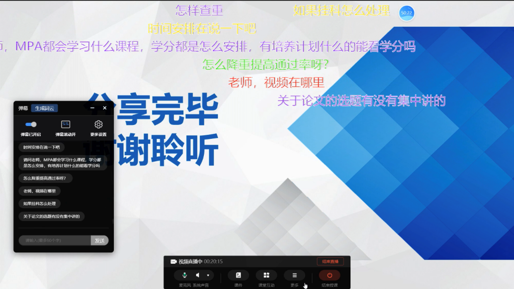 分享会上也提出了具体建议:第一,做好时间管理,处理好工作、学习、家庭之间的关系;第二,及时完成作业,重视作业对毕业论文选题、撰写的准备和铺垫作用;第三,保持与导师和同学沟通交流,不断提升人际沟通技能;第四,紧跟学校开题、内审、答辩各项工作安排,不掉队;第五,充分利用好学校图书馆等资源,切实提升学习和写作能力,完成论文撰写工作,顺利毕业。在分享会交流环节,崔赫同学还结合自身学习经验,详细解答了同学们提出的各种问题。首次分享会收到了良好的效果,后续专业学位中心将陆续邀请其他优秀在读和毕业学生开展经验分享,助力专业学位研究生共同进步。