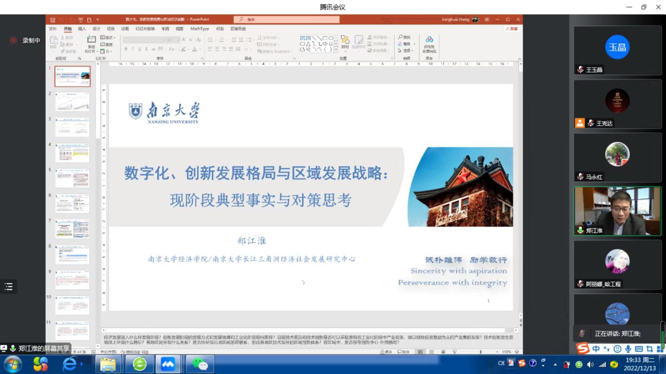 12月13日,经济学系邀请南京大学经济学院院长郑江淮教授为我院师生做“数字化、创新发展格局与区域发展战略”专题讲座。郑江淮教授,南京大学产业经济学系教授,博士生导师,商学院副院长,经济学院院长,《南大商学评论》副主编,获第五届刘诗白经济学奖、第一届卫兴华优秀论文奖、第二届/第七届《中国工业经济》优秀论文奖、江苏省教学成果奖获一等奖(2021)、教育部人文社会科学优秀成果二等奖。主持国家社科基金重大项目2项、 国家社科基金重点课题等重要课题数十项。在《经济研究》《管理世界》《中国工业经济》《世界经济》《Scientific Inquiry》等国内外重要期刊发表论文100余篇,出版专著20余部。马永红教授主持了讲座,我院教师及硕博同学共80余人参加了此次讲座。