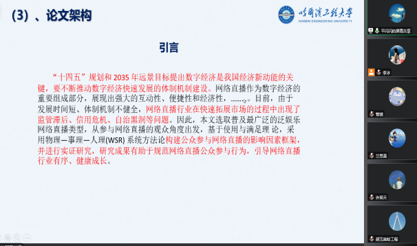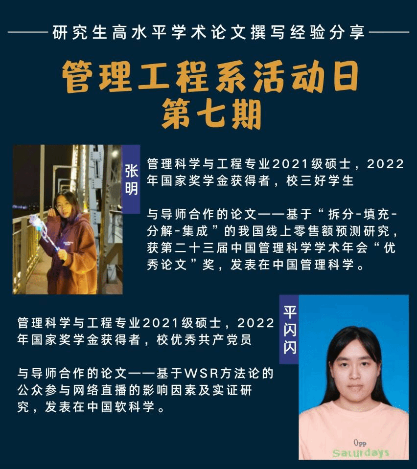 为提高研究生高水平论文撰写能力,2022年12月14日晚7点,管理工程系组织了“管理工程系活动日”第七期交流活动。本次讲座邀请了2022年硕士研究生国家奖学金获得者——管理科学与工程专业张明同学和平闪闪同学,讲座由管理工程系主任李冰老师主持,在读的硕士研究生和部分老师参加了此次交流活动。