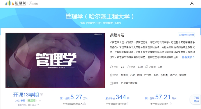 《管理学》在线课程于2018年3月在智慧树平台上线运行,选课量一直在智慧树平台同类课程中位列第一。截至目前已经开课13个轮次,累计有344校次的5.27万人选修了本课程、57.21万人次参与了课程互动。课程2018年获评黑龙江省精品在线开放课程,2019年获评黑龙江省线上线下精品课程,同时连续4次被评为智慧树网精品课程,课程负责人杨贵彬教授被评为智慧树网共享课程教学名师。
