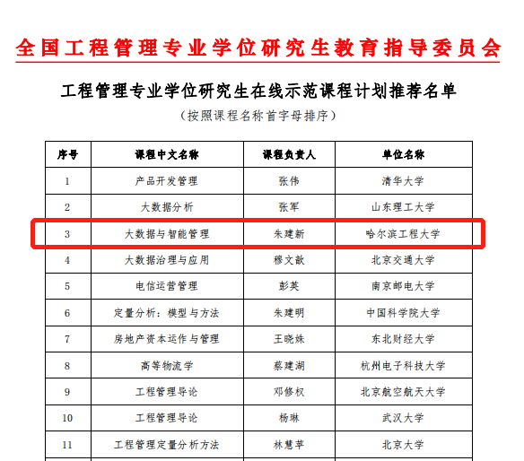 近日,全国公共管理专业学位研究生教育指导委员会公布首批公共管理硕士(MPA)专业学位研究生在线示范课程建设计划名单,全国共有55门课程入选该计划,我院李拓晨老师作为课程团队负责人申报的《海洋与经济管理》课程,经文本检查核实、专家组评分、教指委工作会评议等多轮评审环节,成功入选。至此,我院共有三门专业学位课程获批首批研究生在线示范课程建设计划,其中朱建新老师课程团队申报的《大数据与智能管理》获批工程管理硕士(MEM)专业学位研究生在线示范课程建设计划,孙希波老师课程团队申报的《职业规划》获批工商管理硕士(MBA)专业学位研究生在线示范课程建设计划。