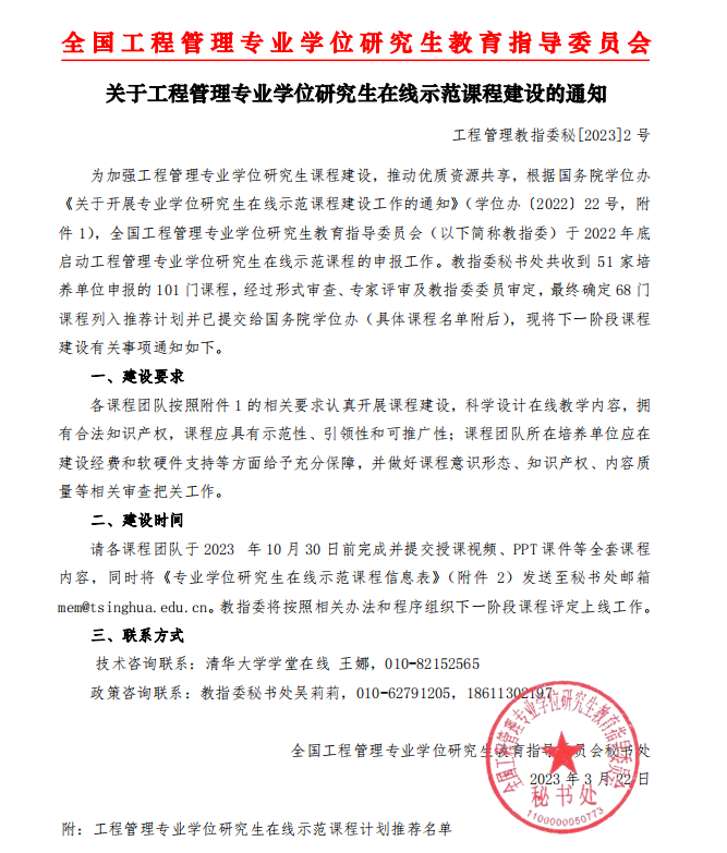 为深入贯彻习近平总书记对研究生教育工作的重要指示精神,落实《教育部 国家发展改革委 财政部关于加快新时代研究生教育改革发展的意见》(教研[2020]9号)要求,加强专业学位研究生课程建设,加快教育数字化转型,推动优质资源共享,2022年11月,国务院学位办下发《关于开展专业学位研究生在线示范课程建设工作的通知》,委托全国专业学位研究生教育指导委员会建设各专业学位类别研究生在线上示范课程,通过示范构建课程育人新模式,促进线上线下教学融合发展,推动高校加大课程建设投入,引导广大教师重视课程教学质量,切实发挥课程教学在研究生社会责任、创新意识、专业水平、实践能力、职业素养培养中的基础作用。在线示范课程将统一接入国家高等教育智慧教育平台,供学生课程学习、教师教学参考、学校学术交流。