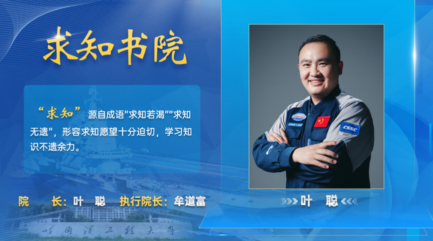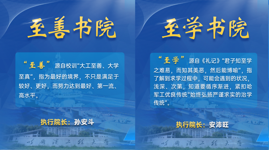 书院命名涵盖哈军工传统、学校学科特色以及学校办学七十年秉持的办学理念和价值观。书院分布于校园三个区域,命名分别以“求”“海”“至”为关键词。以“求”命名,代表追求、目标、价值观,是办学理念;以“海”命名,代表特色、领域,是战略选择;以“至”命名,代表到达、实现,是发展实践。