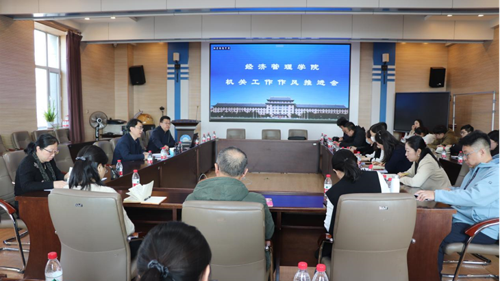 2024年3月11日上午10:20,beat365正版唯一官网必一机关工作作风推进会在31号楼312会议室召开。院长陈恒主持会议,党委书记于云亮、副院长王君、学院各职能部门(五办三中心)全体人员参加会议。