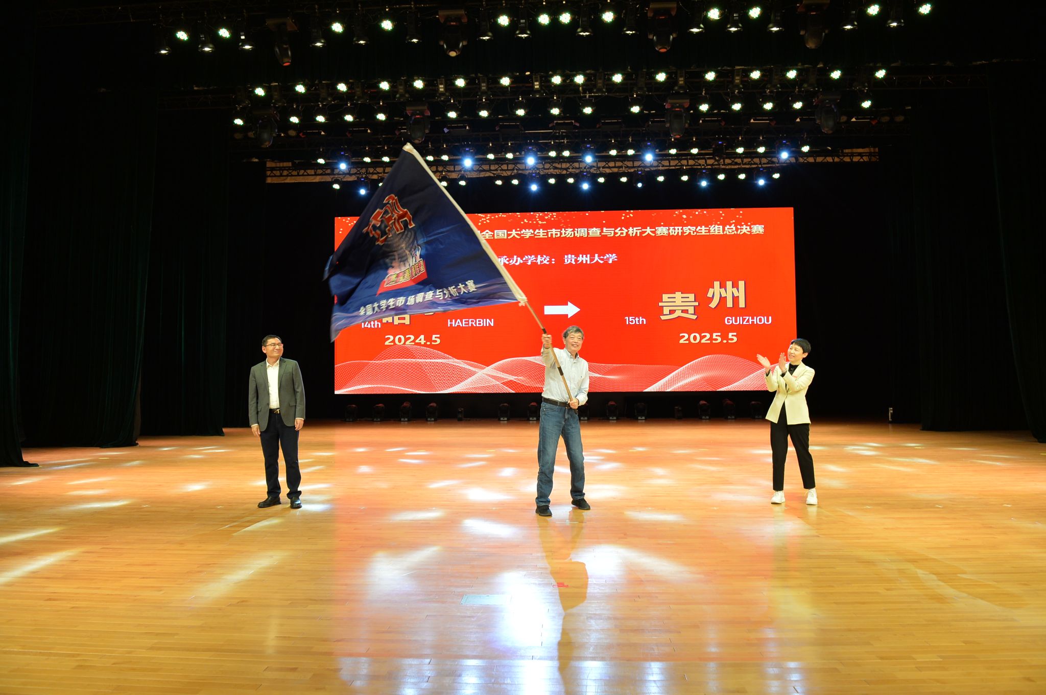颁奖结束后,进行了赛旗交接仪式。中国商业统计学会会长、大赛组委会主任金勇进教授从beat365正版唯一官网必一校副校长於志文教授手中接过大赛赛旗,交给了下届大赛研究生组总决赛承办单位贵州大学党委副书记张洁。
