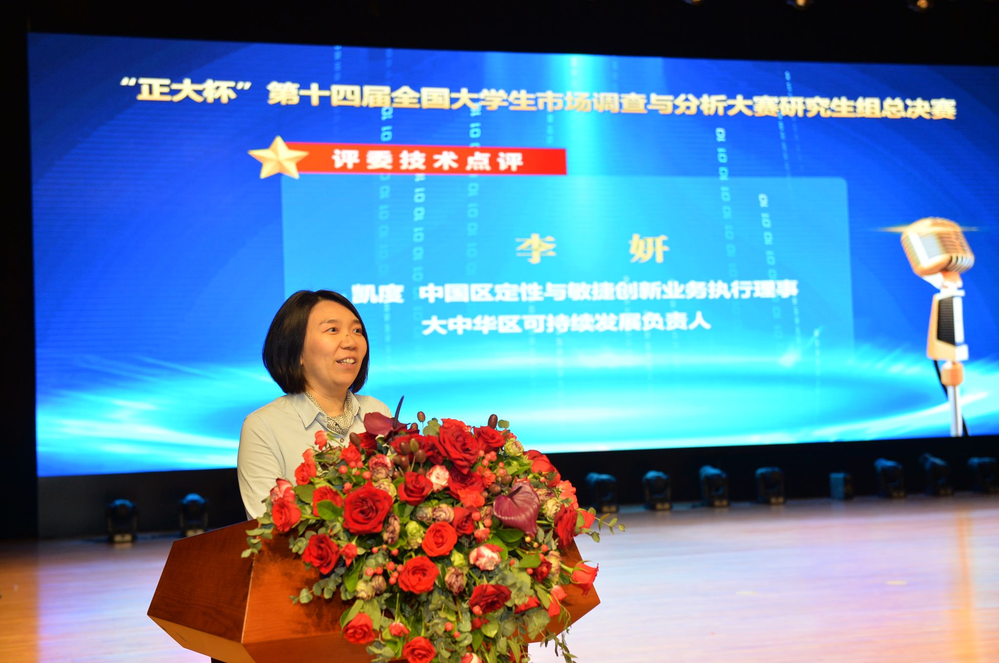 凯度中国区定性与敏捷创新业务执行理事、大中华区可持续发展负责人李妍以“广度”、“深度”、“高度”和“温度”四个关键词概括了大赛的发展方向。她指出,大赛的参赛队伍呈现多样化,促进了多元包容文化的建设。在研究方法上,参赛者运用了定性定量结合、大数据和大语言模型分析等方法,展现了研究的深度。她强调,创新意识和学术价值是大赛的初心,鼓励学生在田野调查中获取一手数据,以提高专业水平。此外,李妍也提到了大赛的亮点——对创新能力的重视,她观察到许多队伍在选题、研究方法和观点提炼上都有所突破。最后,她提到了参赛队伍对社会问题的关注,希望学生能带着情感投入,以研究促进社会进步。李妍期待大赛未来能越办越好,为社会培养更多有深度、有高度、有温度的人才。