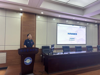 会上,胡玉真首先从学术诚信的政策规范和行为准则等方面详细阐释了学术诚信的具体内容和重要意义,并以学校科研诚信自查清单为例强调了学术论文,科研项目所涉及到的具体问题。随后,胡玉真又列举了一系列学术诚信教育经典案例,并就近期学术诚信相关的热点事件同参会学生进行分享和交流。胡玉真告诫同学们要常怀敬畏之心,坚守诚信底线,做真学问才会有所成长,有所收获。