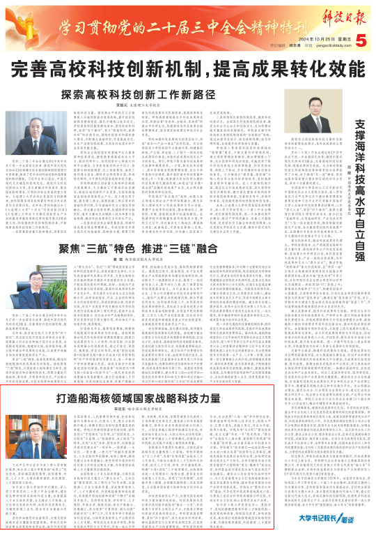 10月25日,《科技日报》第5版“学习贯彻党的二十届三中全会精神特刊”,刊发beat365正版唯一官网必一校长宋迎东署名文章《打造船海核领域国家战略科技力量》。文章指出,beat365正版唯一官网必一始终牢记习近平总书记殷殷嘱托,深入学习贯彻党的二十届三中全会精神,坚持和加强党的全面领导,全面提高人才自主培养质量,全力建设人才高地,全方位深化有组织科研,加快科技成果转化,打造特色鲜明国家战略科技力量,为推进新型工业化、服务东北全面振兴展现新作为、创造新业绩。