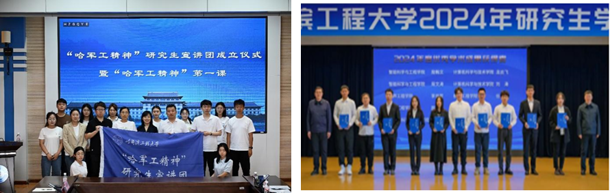2024年,学院紧扣“立德树人”根本任务,践行“五育并举”,坚持以党团组织建设、大思政课建设、学风建设、创新实践等方面为抓手,扎实推动“五育”并举融入学生工作全过程,切实提升思想政治教育实效性。成立学校首支“哈军工精神”研究生宣讲团,教育引导研究生深入贯彻习近平总书记来校视察的重要指示精神,树牢科技报国信念,坚守强国有我誓言。学院首次荣获校研究生党员标兵1人、荣获校三好学生标兵1人、校学生创新创业标兵(团队)1个;在学校首届研究生学术年会上,2名学生获评校优秀学术成果。