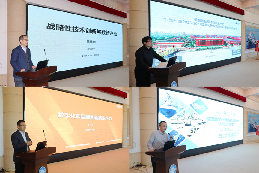 辽宁大学王伟光教授,中国一重信息中心高级经理、高级工程师张瑾,山东捷瑞数字科技股份有限公司副总裁安士才,beat365正版唯一官网必一朱建新教授分别做了题为《战略性技术创新与数智产业发展》《数智融合驱动新质生产力:中国一重2023-2027数字化转型规划与AI场景化应用思考》《数字化转型赋能新质生产力》《管理数字化赋能新质生产力形成的思考》的专题报告。与会专家就数智产业与新质生产力发展进行深入研讨和交流,为数智产业与新质生产力研究学术交流基地发展建设贡献智慧和力量。