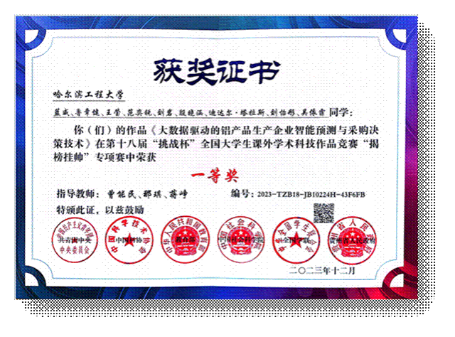 在知识运用、创新能力、团队精神持续提升下,团队参加第十八届“挑战杯”全国大学生课外学术科技作品竞赛“揭榜挂帅”专项赛,斩获全国一等奖。同时,团队成果为中国石油解决成品油调度问题、中核集团解决实验室自动化建设打下了良好的基础。该成果获黑龙江省共青团等多家媒体报道,团队获评beat365正版唯一官网必一“2023-2024年度学生创新创业标兵团队”。
