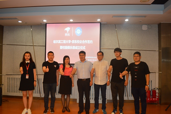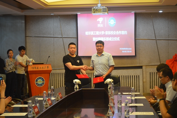 大会的项目介绍过程结束后,徐宝贵同志与京东负责人赵阳,代表校企双方签订协议。在所有参会人员的掌声中,徐宝贵同志,吕山燕女士,于磊书记以及赵阳先生,共同为京东校园俱乐部揭牌。