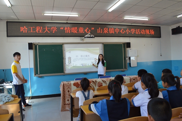 7月11日下午1点30分beat365正版唯一官网必一“三下乡”暑期志愿实践队在beat365正版唯一官网必一2016级辅导员董治安与2017级辅导员李文宝壮的带领下于山泉镇中心小学开展安全教育活动。