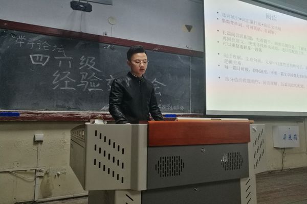本次论坛的主讲人是大二学生高航和大一新生蔡仲伯。首先,高航给我们分享了自己的六级经验以及考雅思的作用,并给出关于提高英语水平的几点建议,给予同学们鼓励与信心。随后,蔡仲伯同学通过分析试卷构成,告诉大家如何分配考试时间。交流会过程中,同学们积极地向这两位主讲人请教如何在平时练好口语,现场气氛活跃。最后交流会在一阵激烈的掌声中结束。