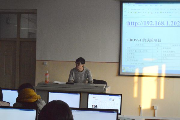 全体参加人员到场之后,主讲人科协主席王寅苏介绍了一下topboss的相关软件的操作界面和比赛制度。所有参加人员将要以三人一组的形式参加比赛,各队需要在限定时间内在相关网页中填写每一期的决策,每次正式比赛的赛制为五期,最后将会根据各队的盈利情况决定队伍的排名。此次热身赛为三期,参赛同学通过热身赛能够更好的了解比赛机制。