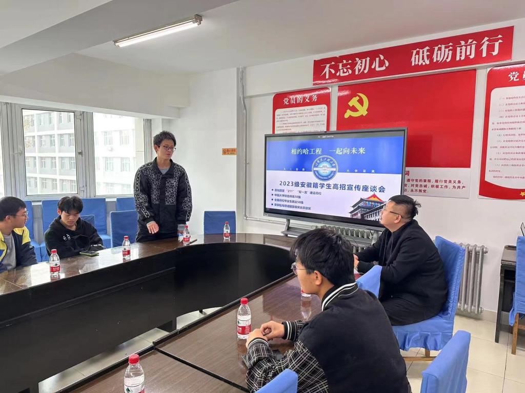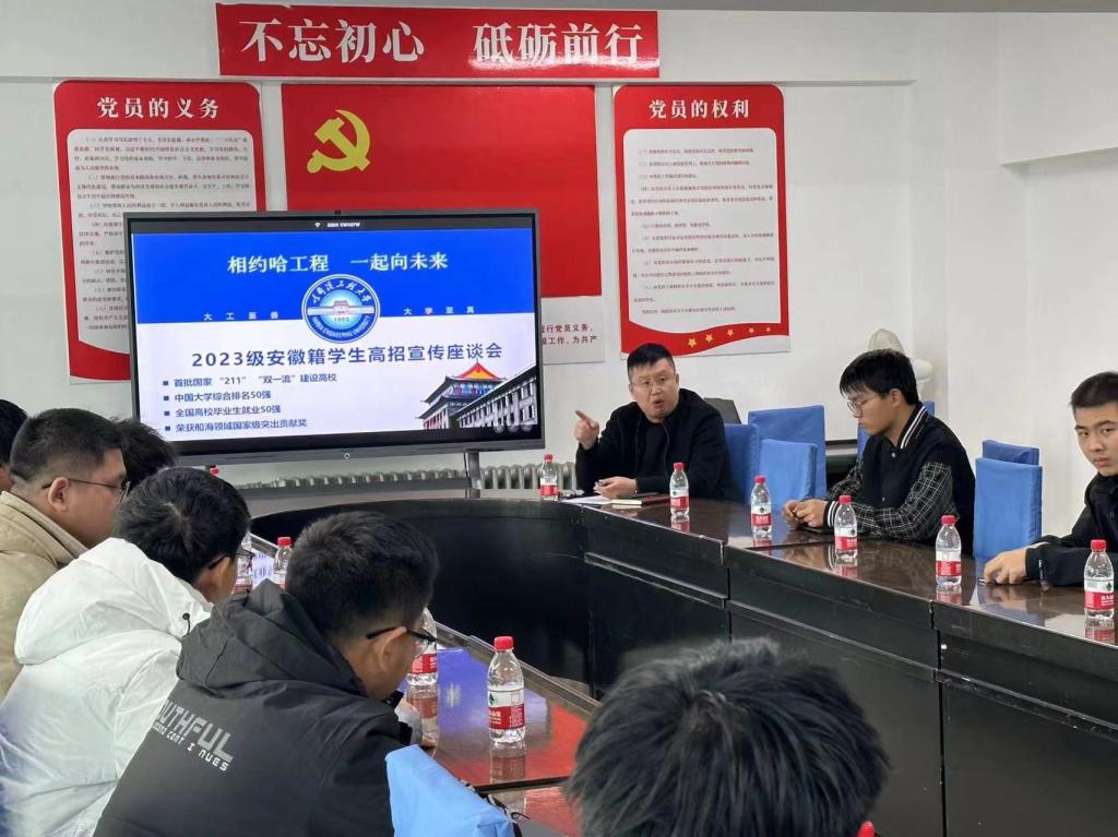 杨溪淼首先对2023级安徽籍本科新生代表们表示热烈欢迎,与他们进行如何与学校相识以及对学校招生宣传工作有何建议等方面的探讨。座谈会上,同学们积极地分享自己与哈工程的故事,比如通过什么途径来了解哈工程,来到学校后又有何收获等。有的同学表示是经过亲友介绍,也有同学表示是通过网络上的宣传从而认识到哈工程并产生了兴趣。
