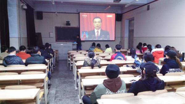 在观看过程中,同学们认真聆听了李克强总理所作的《政府工作报告》,做好报告记录,深刻体会总理所讲的每一句话,观看现场不时响起热烈的掌声。观看结束后,同学们纷纷表示要继续学习、领会十二届全国人大五次会议精神,始终牢记历史赋予的责任。