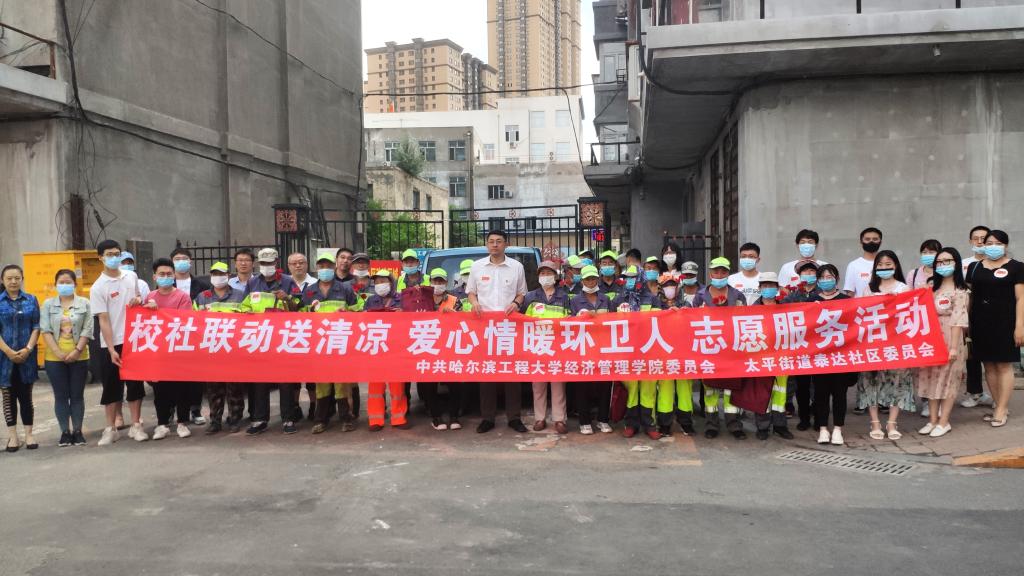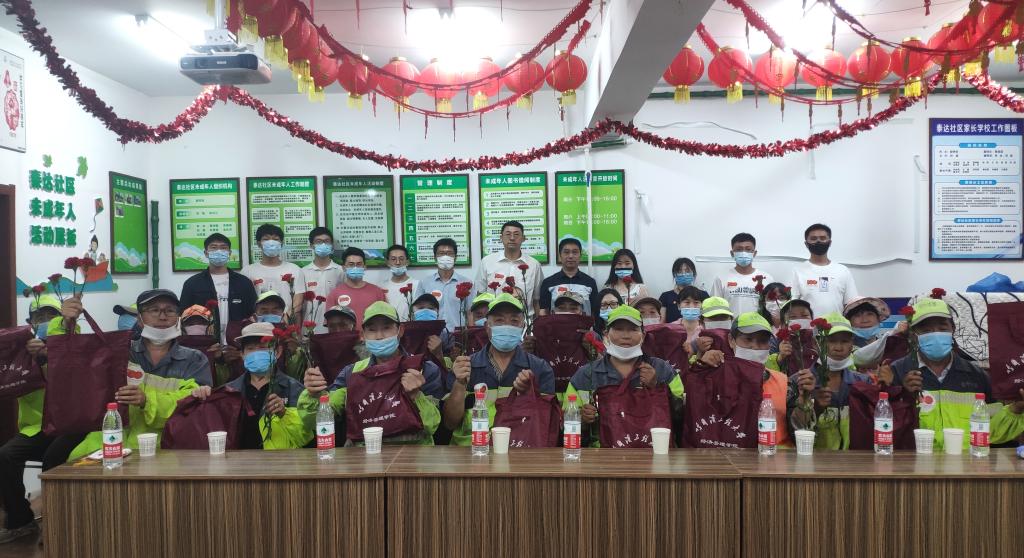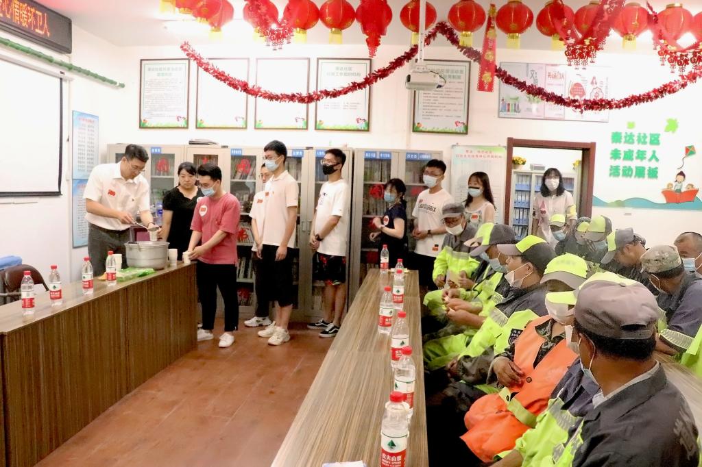 此次学院党委与泰达社区联合开展的“校社联动送清凉 爱心情暖环卫人”志愿服务活动中,学院党委副书记吴雷与环卫工人们亲切交流,送出美好祝愿。学院的师生党员们将煮好的绿豆汤逐一发到了环卫工人手中,随后为辛苦在一线的环卫工人赠送鲜花,口罩,湿巾,凝胶,毛巾等防疫大礼包。捐赠现场一片爽朗而愉快的笑声,炎炎夏日里,爱心物资“清凉”地温暖了环卫工人。活动后,环卫工人发来微信:炎炎烈日,是你们给我们带来了凉意。感谢你们的爱心举动。我们会把我们的家园打扫的更加干净,整洁。学院在了解到泰达社区“关爱失独家庭”情况时,主动为三户失独老人家庭捐赠防疫礼包和鲜花,委托社区工作人员送至家中。
