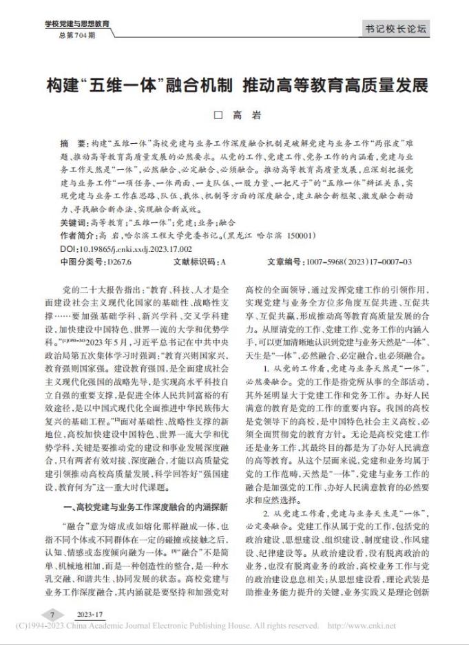 近日,《学校党建与思想教育》杂志2023年第17期“书记校长论坛”专栏刊发学校党委书记高岩文章《构建“五维一体”融合机制 推动高等教育高质量发展》。