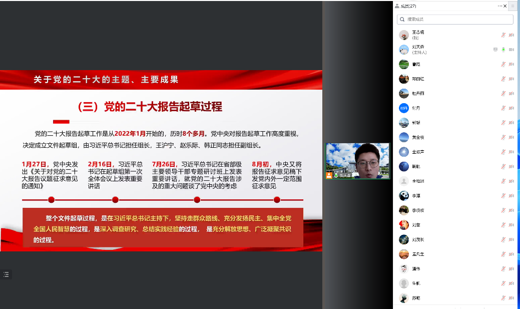 根据学校党委的整体部署和具体要求,2022年12月14日,工商管理党支部开展“深入学习宣传贯彻党的二十大精神加快建设船海核领域中国特色世界一流大学”主题宣讲活动。此次活动由工商管理党支部书记刘天森同志主持并进行宣讲。